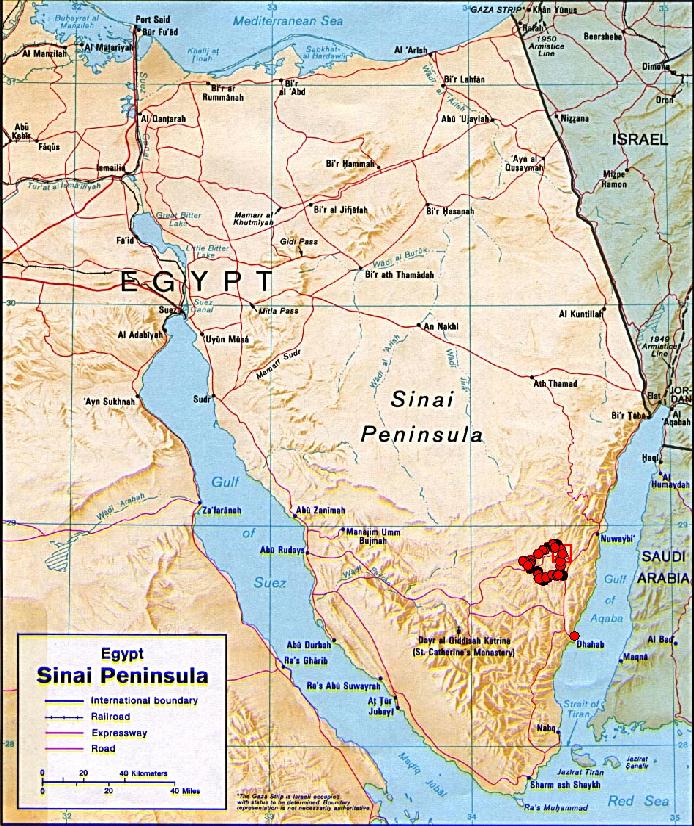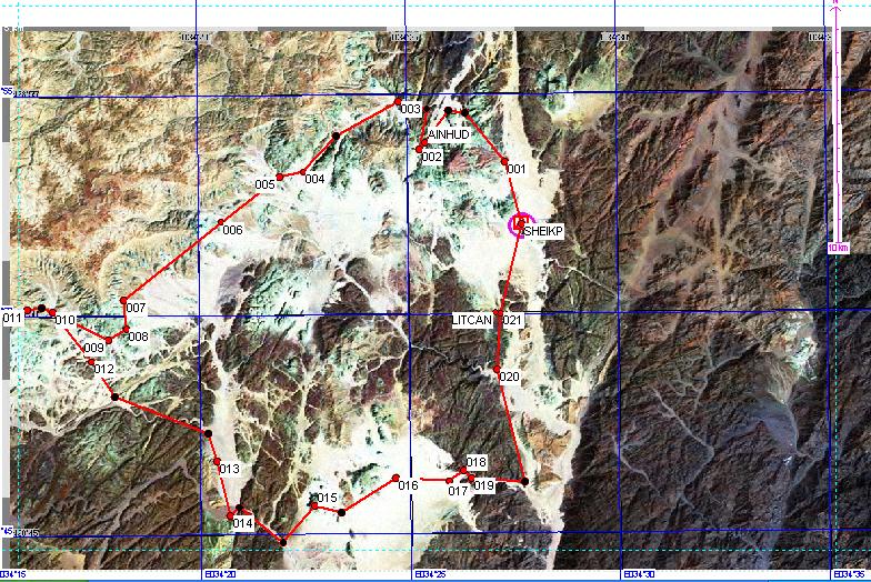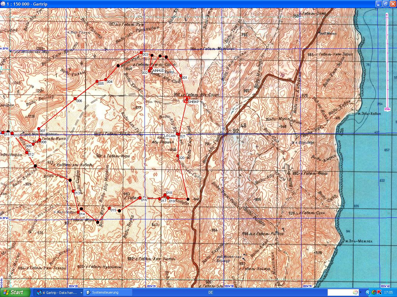 Diesmal wurde es eine Rundreise, die wie immer bei Sheik Hamid im Wadi Gazala begann. Zuerst ging es zur Oase Ain Khoudra (02) dann weiter nach Nordost durchs Wadi Rum (03) weiter ins Wadi Arada 10), wo wir durch eine beeindruckende Schlucht (11) kletterten. Weiter in südlicher Richtung über die Asphaltstraße zum Bir (Brunnen) Safra (14)(nur Kamelwasser). Dann zum Gebel (Berg) Barga (15), weiter zum Lochfelsen (wholy mountain) und zum Djebel Macharom (17) und im großen Bogen zurück zum Sheik.